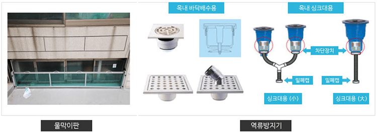 바닥, 세면대, 싱크대, 좌변기, 세탁기 배수구 등